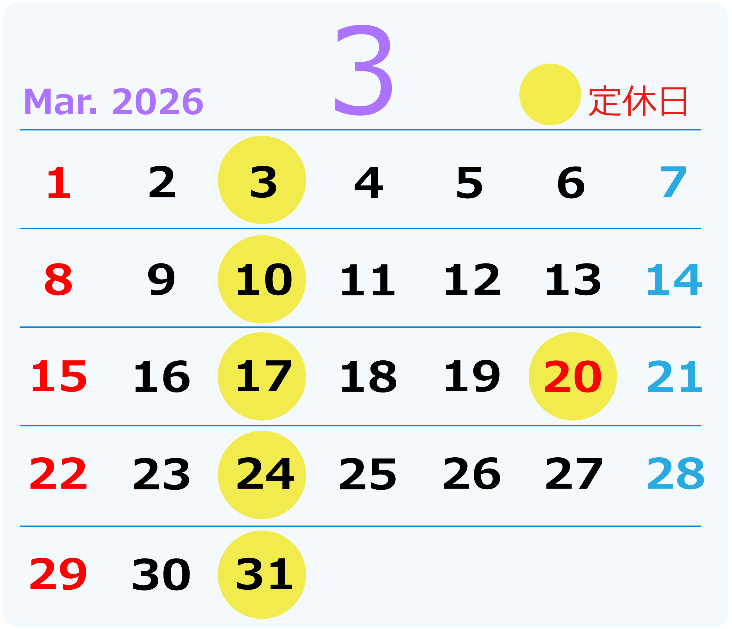 2026年3月の営業カレンダー
